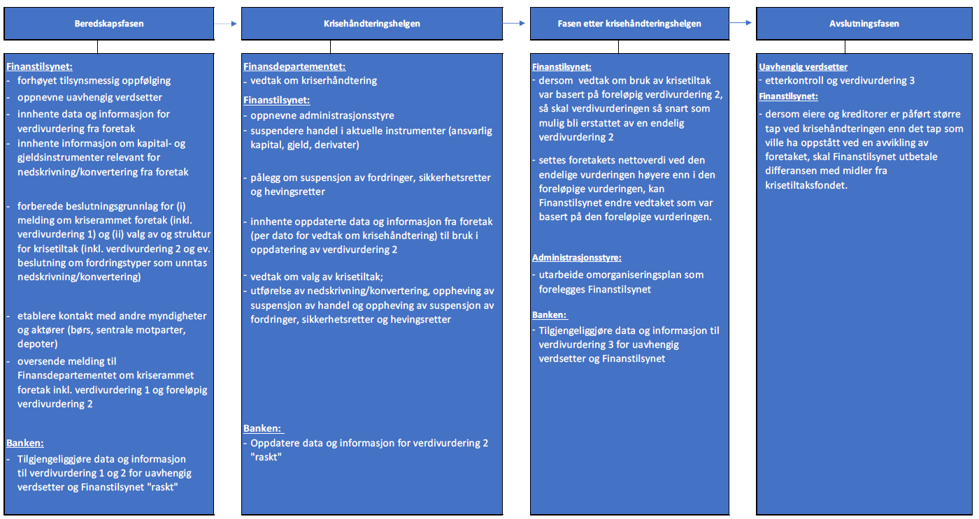 Regelverket legger opp til at en krisehåndtering kan deles inn i klart definerte faser, jamfør figuren under. De operasjonelle stegene som omfatter mekanismen for intern oppkapitalisering finner sted under perioden som betegnes som krisehåndteringshelgen5), fra vedtaket om krisehåndtering fattes frem til eiere av ansvarlig kapital har fått nedskrevet sine egenkapitalinstrument og eiere av bankens relevante fordringer har fått konvertert sine gjeldspapirer til ny ansvarlig kapital.